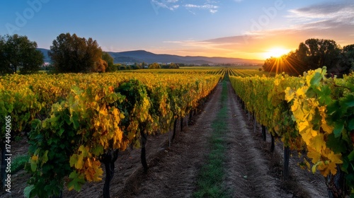 © Gulnaz, Naklejka premium A row of grape vines with the sun shining on them