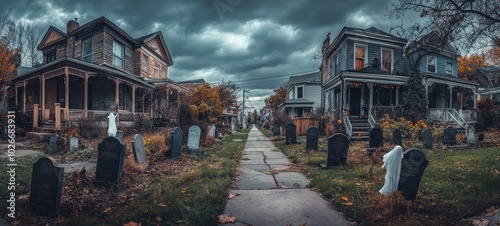 © Emil, Fototapeta premium A row of houses with intricate Halloween decorations.