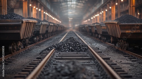 © Sawat, Fototapeta premium A row of industrial mining carts filled with raw coal lined up on a railway track.