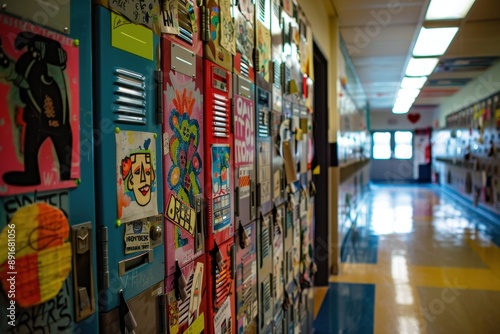 Fototapeta premium A row of lockers in a school hallway, each decorated with personal touches...