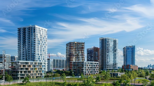 © Chandara, Fototapeta premium A row of minimalist, contemporary skyscrapers against a blue sky.