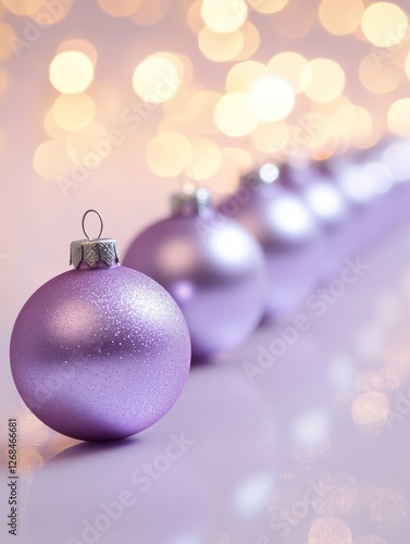© Niken, Fototapeta premium A row of purple Christmas ornaments on a light violet background, with reflections and bokeh lights. The festive decorations look elegant against the soft pastel color backdrop