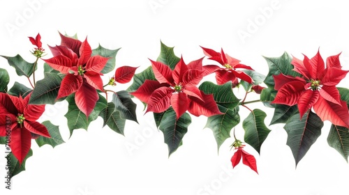 Fototapeta premium A row of red poinsettias with green leaves. Suitable for holiday decorations...
