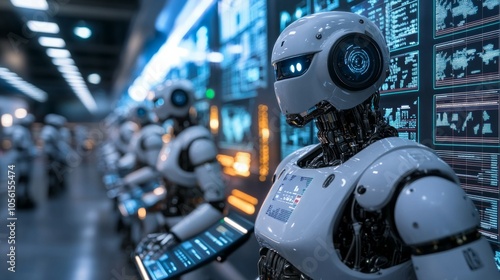 Fototapeta premium A row of sleek robots operating at trading terminals