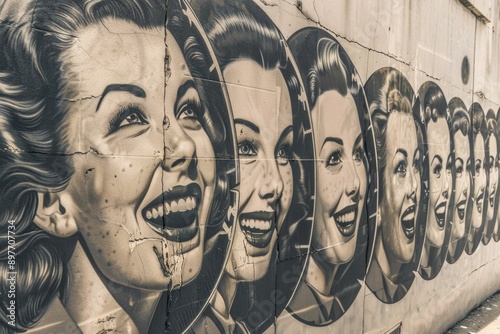 © Konstiantyn Zapylaie, Naklejka premium A row of smiling women are painted on a concrete wall, their expressions full of joy and optimism