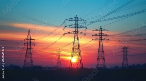 Fototapeta premium A row of tall electricity transmission towers silhouetted against a vibrant...