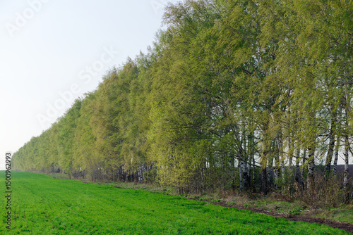 © AeroDrone, Fototapeta premium A row of trees with green leaves