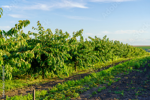 © Iurii Gagarin, Fototapeta premium A row of trees with green leaves and a field in the background