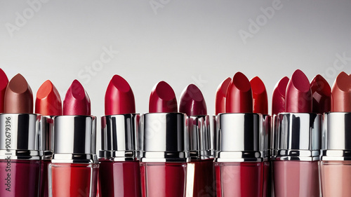 © janzwolinski, Obraz premium A row of various shades of lipsticks with shiny metal caps displayed against a neutral background.