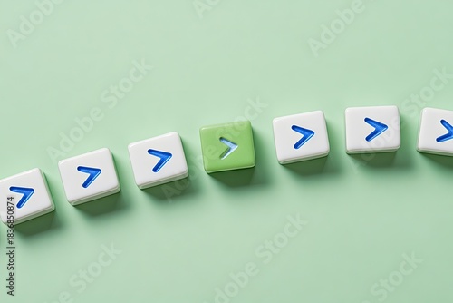 © Iyan, Obraz premium A row of white cubes, each with a blue or pale green arrow, curving on a mint green surface. One cube is a contrasting pale green