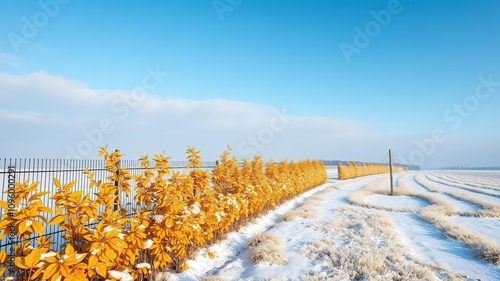© chaiwat, Fototapeta premium A row of yellow autumn leaves along a snow-covered fence fading into the distance against a blue December sky, yellow autumn leaves, snow covered fence