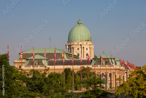 © sebi_2569, Obraz premium A row with various historical Hungarian flags near the Karmelita monastery in Budapest - Hungary