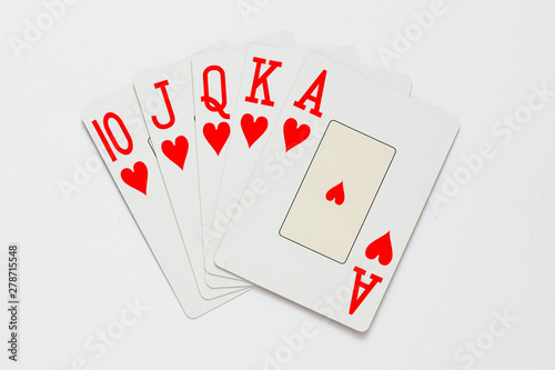 Obraz premium A royal straight flush playing cards poker hand in hearts.