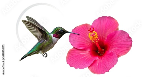 © budi, Obraz premium A ruby-throated hummingbird hovers while feeding on nectar from a vibrant pink hibiscus flower.