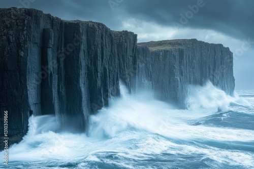 © Diffin, Fototapeta premium A rugged cliff faces a powerful wave crashing against its side.