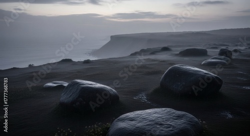 Obraz premium A rugged coastal scene with large stones, mist, and a distant headland under...