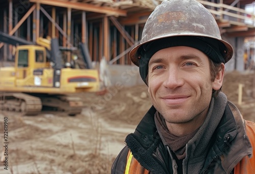 Fototapeta premium A rugged construction worker wearing a hard hat and helmet smiles confidently...