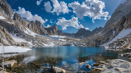 © Justlight, Fototapeta premium A rugged mountain pass with a glacial lake offering breathtaking views and a refreshing location for an ice bath.