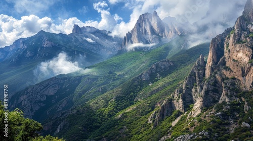 Fototapeta premium A rugged mountain pass with steep cliffs and breathtaking views, challenging yet rewarding for adventurous travelers.