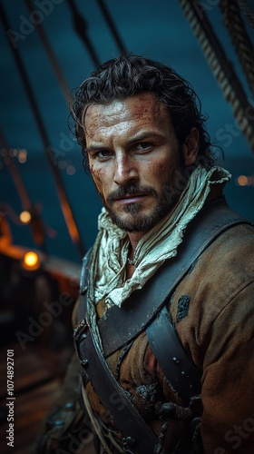 Naklejka premium A rugged pirate on a ship.