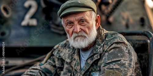© Irina Ukrainets, Obraz premium A rugged veteran with a wise gaze sits against a military backdrop. His well-worn features tell stories of bravery. The style combines realism with a hint of nostalgia. AI