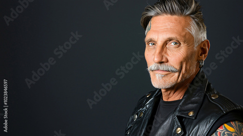 Obraz premium a rugged 60-year-old biker with salt-and-pepper mustache and tattoos, leather jacket