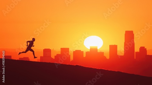 © Exnoi, Naklejka premium A runner is running on a hill with a city in the background
