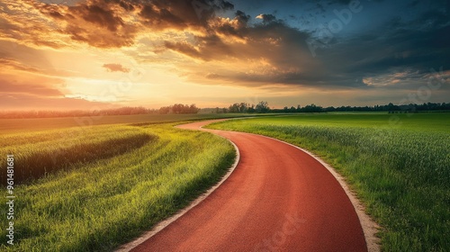 Fototapeta premium A running track curving through green fields with a dramatic sky in the...