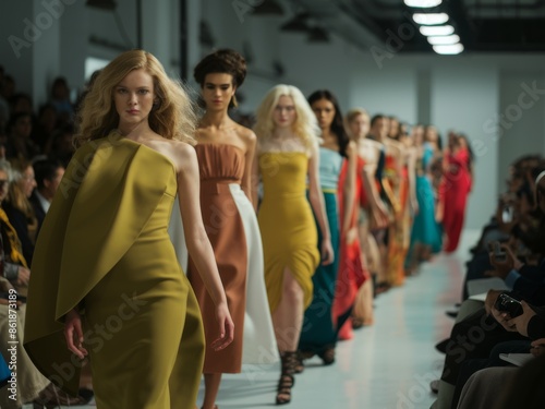 © starush, Fototapeta premium A runway of a group of women walking down the catwalk, AI