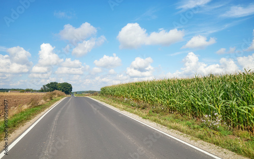 Fototapeta premium A rural asphalt road among fields, Poland.
