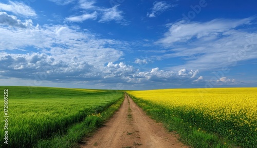 © kin, Obraz premium A rural dirt road stretches through vibrant fields