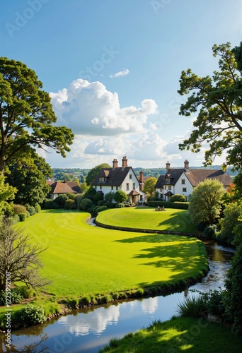 Naklejka premium A rural haven of stone homes with tiled roofs amidst bright green landscapes
