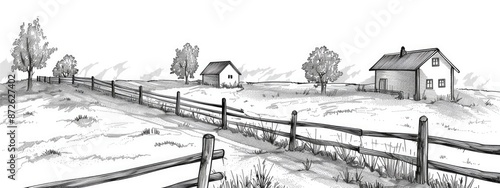 © Pihta, Fototapeta premium A rural landscape with rustic houses enclosed by a low wooden fence. Sketch illustration.