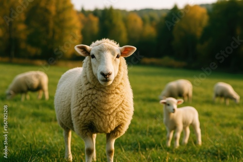 © AkuAku, Fototapeta premium A rural scene featuring a sheep among lush greenery and fellow sheep in an open landscape.