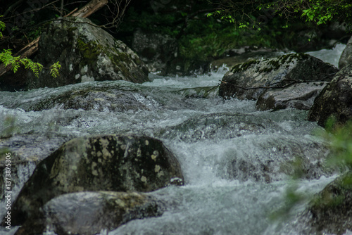 Fototapeta premium a rushing mountain stream among the vegetation in the Slovak Tatras
