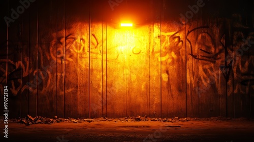 © Paul, Obraz premium A rusted, decaying wall with layers of graffiti, splashes of faded paint, dark earthy tones, high contrast lighting, grunge aesthetic, chaotic yet artistic design