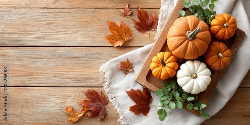 © AnuStudio, Fototapeta premium A rustic autumn arrangement with pumpkins, leaves, and greenery on a wooden table, evoking a cozy fall atmosphere.
