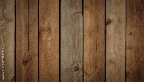 © Gilang, Naklejka premium A rustic background of vertical wooden planks in various shades of brown, showing natural grain, knots, and texture.