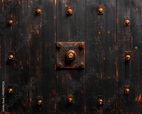 © MiddleMay, Fototapeta premium A rustic black wooden door with decorative metallic studs and a central fixture, showcasing a weathered texture.