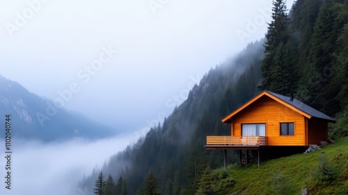 © Pinklife, Fototapeta premium A rustic cabin stands on a mountain slope above a fog-shrouded valley, offering stunning views of a dense pine forest, evoking a sense of adventure and escapism.
