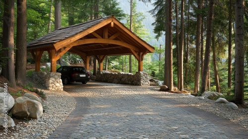 © Phetdaoheuang, Obraz premium A rustic car park design using timber and natural stones, blending into a forested environment