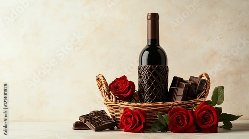 Naklejka premium A rustic chocolate wine bottle placed in a wicker basket with chocolates and red roses, isolated on a pale cream background