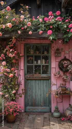Fototapeta premium A rustic cottage door adorned with blooming pink roses and potted plants,...
