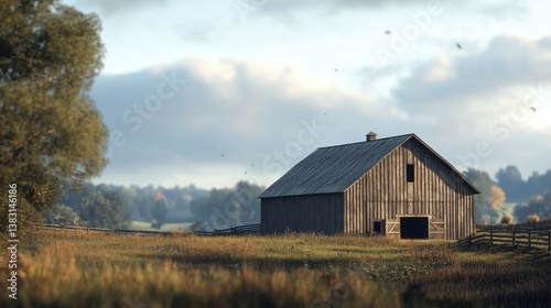 © savittree, Obraz premium A rustic countryside barn with rolling fields.