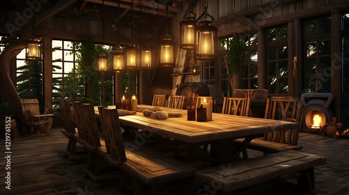 © Numan, Fototapeta premium A rustic farmhouse kitchen with reclaimed wood vintage furniture and a warm, inviting atmosphere, alongside a rustic dining room with large wooden accents and reclaimed wood elements.