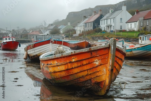 Fototapeta premium A rustic fishing village on the coast of Ireland, with weathered boats bobbing in the harbor, waiting for their next journey