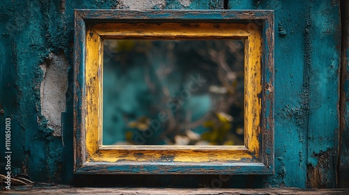 © owen, Naklejka premium A rustic frame with a vibrant yellow border sits against a weathered blue surface, reflecting a blurred natural background.