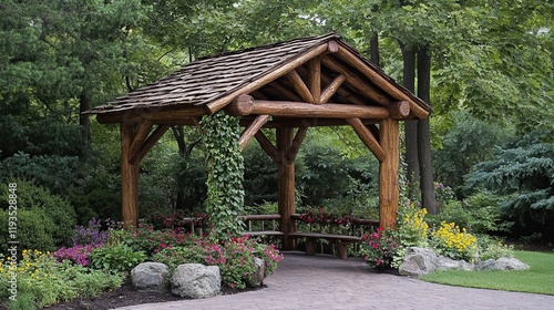 Naklejka premium A rustic gazebo in a flower garden with ivy climbing the wooden beams
