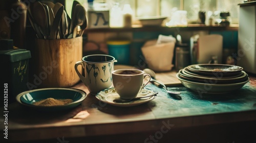 Obraz premium A rustic kitchen counter scene with coffee and tableware displayed