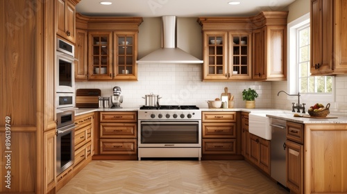 Fototapeta premium A rustic kitchen with wooden cabinets, vintage appliances, and a large...